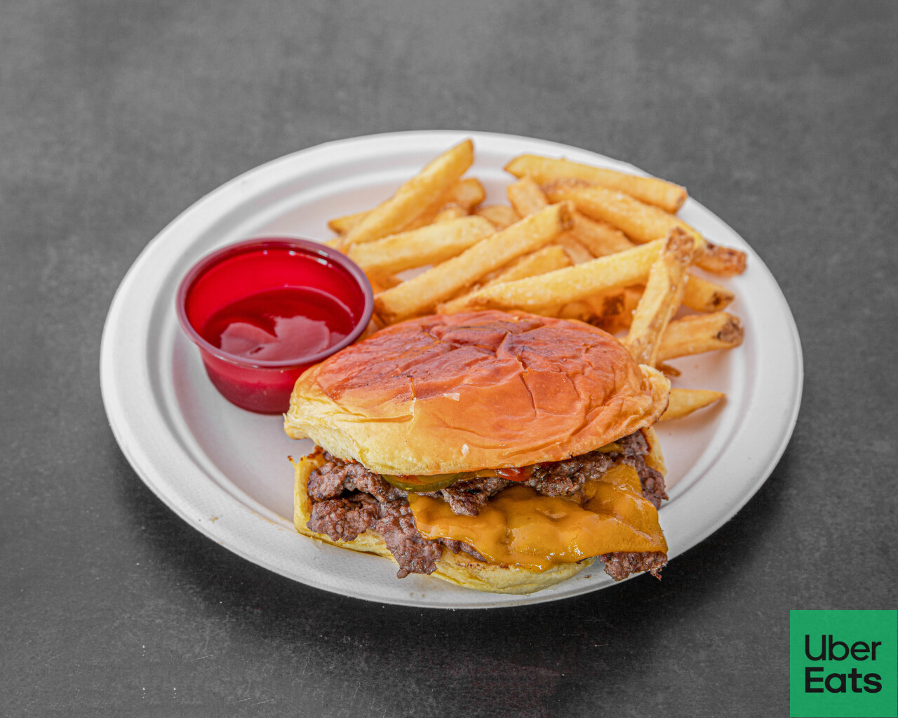 Acompañada de patatas fritas doradas, como debe ser. Una burger con historia, carácter y puro sabor USA en cada bocado.