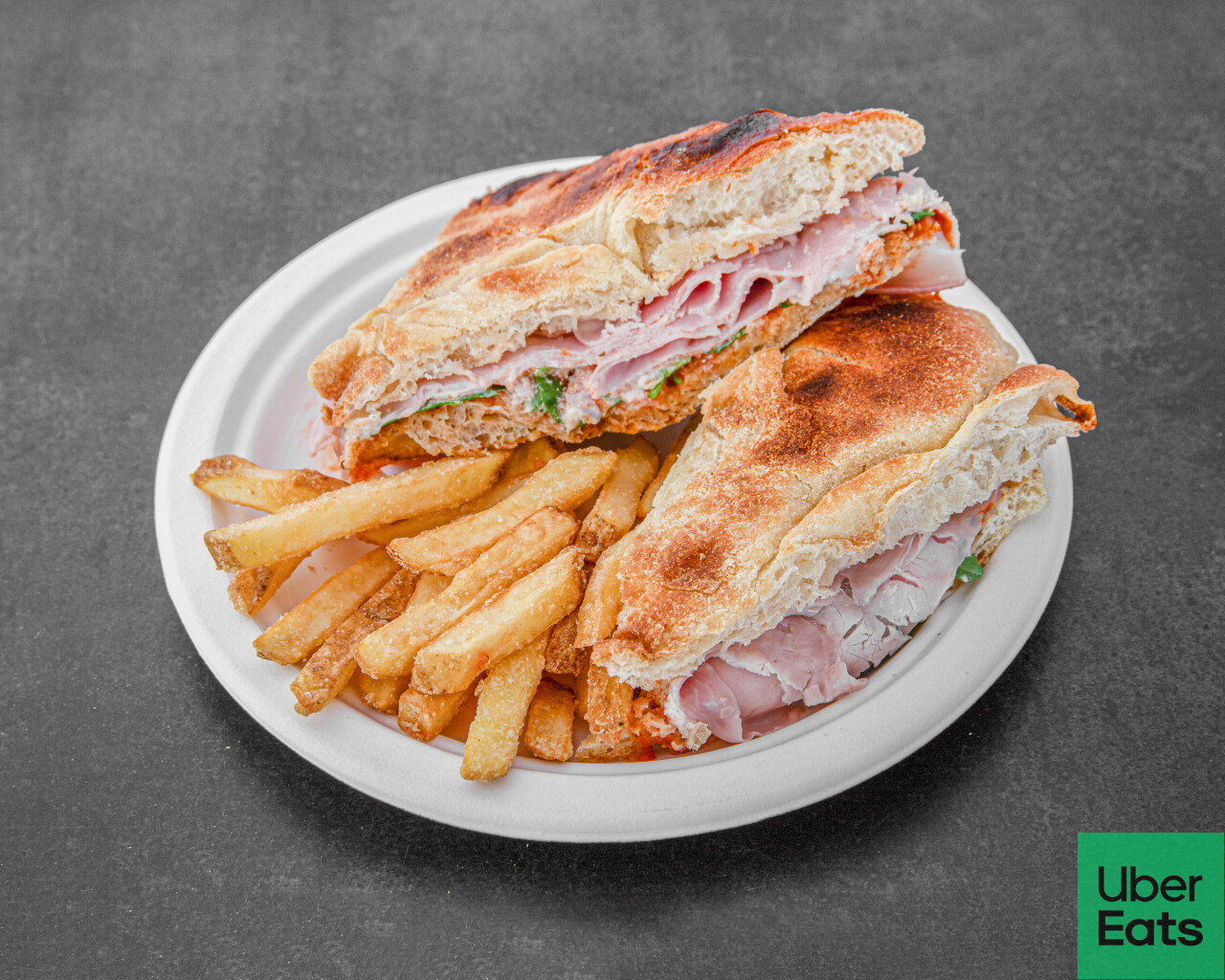 Pan de focaccia artesana, jamón york de corte fino, burrata cremosa, rúcula fresca, un toque de salsa de tomate y albahaca casera que le da el frescor perfecto, acompañada con patatas fritas.
